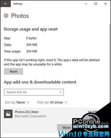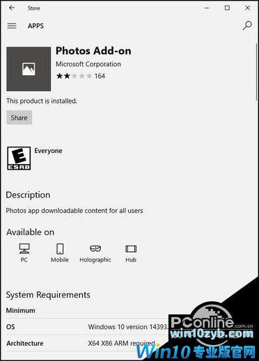 看起来,Photo Add-on应该是Photo照片应用的一个更新,同时在照片应用属性中,也能看到“Photos.DLC.Main”的扩展描述,体积竟然达到了141MB之巨。(笔者的Windows 10已经打了最新补丁不过没见到这个)