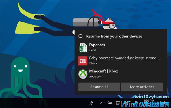 除了恢复过去的活动,通过时间轴,个人数字助理Cortana也会显示你可能需要恢复的活动,比如说你想在你的手机、笔记本或者其他支持Cortana的设备之间进行任务切换。这样可以确保高效性。