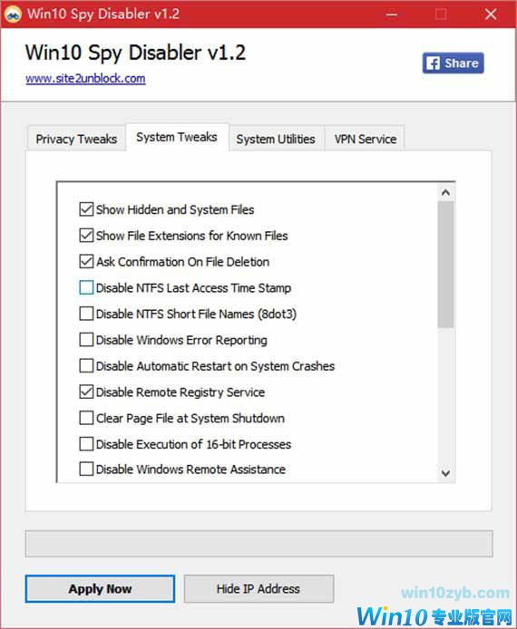 若利用Win10 Spy Disabler,就可免去这一麻烦。只需点击软件的“System Tweaks(系统调整)”选项卡,选择系统调整项目,之后点击“Apply Now”按钮即可完成设置(图2)。