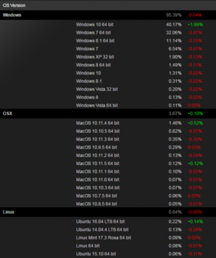 今日,著名的游戏平台Steam公布了5月份平台调查数据报告。报告显示,Windows 10 64位操作系统Steam游戏玩家最常使用的系统,其占比高达40.17%,比四月还上涨1.99%。排在其后的两位分别是占比32.06的Windows 7 64位操作系统和占比11.14%的Windows 8.1 64位操作系统。值得一提的是,苹果操作系统OS X整体比上个月上升了0.1%,达到3.67%。而Linux则整体下滑了0.06%,到0.84%。