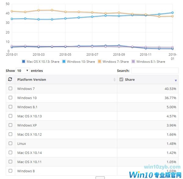 在过去一年中,Windows 10份额增长了6.61个百分点,Windows 7份额则只下降了5.20个百分点,一度还达到43.57%。