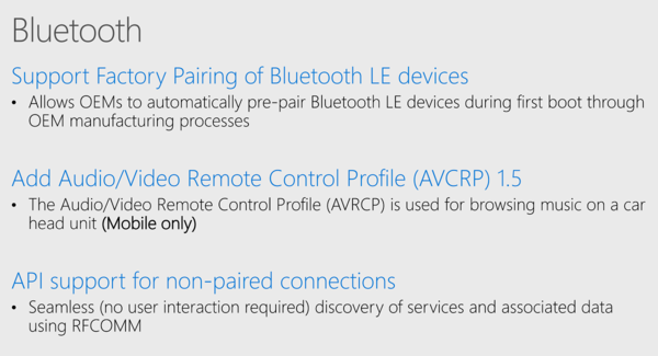 升级蓝牙协议栈Win10 Mobile音频/视频远程控制协议(AVCRP)升级到1.5版本,允许用户在车载蓝牙播放设备上控制音乐播放,通过RFCOMM串口仿真协议无缝发现和接入其他蓝牙设备。