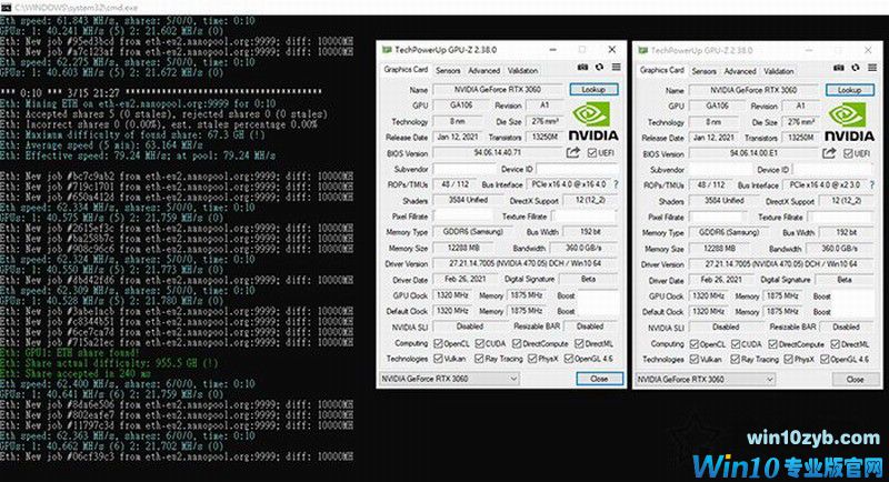 此外外媒还测试了2块不同显卡,分别是RTX3060和RTX3070,如果RTX3060插到第一个插槽,RTX3070插到第二个插槽之后,这两块显卡均可以正常挖矿,但是将两块显卡调换插槽插入,由RTX3070输出画面依然会受到限制,可能原因是必须搭配全速的PCIe x16通道,如果是这样的话,那RTX3060多卡挖矿限制依然无法破解,因为矿机基本是PCI-E X1转X16转接器。