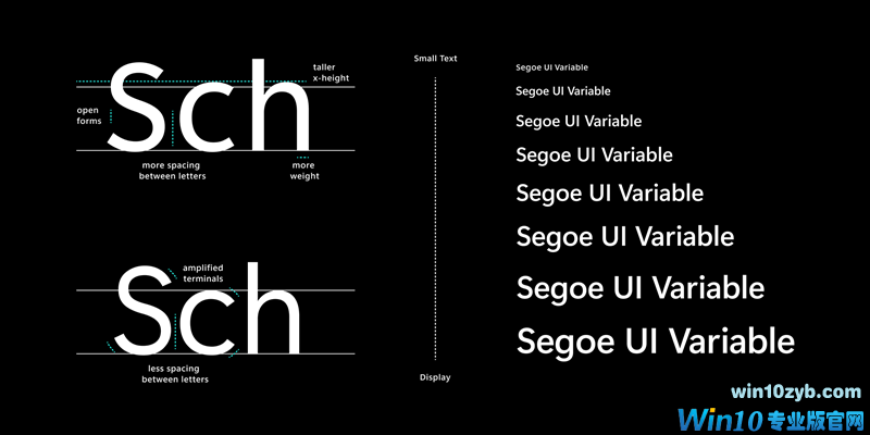 从历史上看,用于打印小文本的字体的设计与为大显示文本设计的字体不同。Segoe UI 最初设计为 9pt 工作,这使得它成为该尺寸的一种大字体,但限制了大尺寸的表达,在更小的尺寸上也缺乏可读性。Segoe UI 变量通过使用新版本的 Segoe 来解决这个问题,该版本使用可变字体技术在非常小的尺寸和大尺寸的样式下动态地提供出色的可读性。