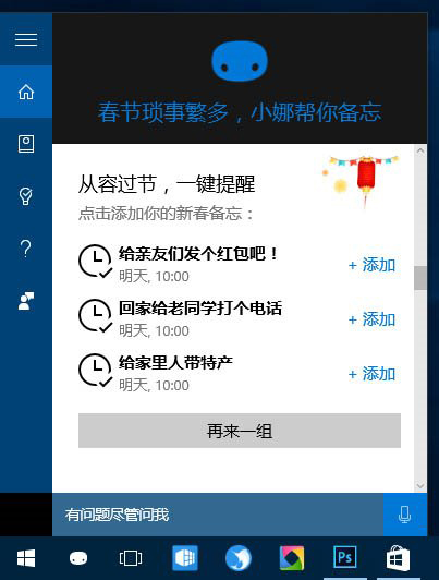 现在微软小娜为中国用户特别献上“新春备忘录”一键提醒功能,帮你从容面对,同时为你的春节增添一些亮色与新意。该一键提醒功能支持跨平台,可在Win10、Android以及iOS平台中使用,并且只需在一部设备中设置,所有平台设备均会受到提醒(需要使用同一个微软账户登录),确保万无一失。