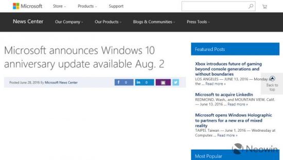 微软今年早些时候在其Build 2016开发者大会上宣布Windows 10周年更新。外界传闻Windows 10周年更新的发布日期是Windows 10发布一周年之际,即今年7月29日。微软还没有给出Windows 10周年更新确切的发布日期,但是今天出现在微软新闻中心的一篇新闻稿的标题是:“微软宣布Windows 10周年更新8月2日正式推出”,但是新闻稿没有具体内容,目前微软已经删除这篇新闻稿。