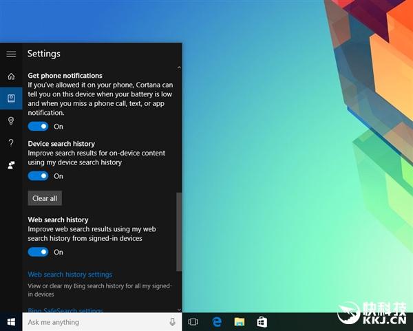 第三,PC端接受手机信息通知:小娜设置项中新增“Get Phone Notifications”,可以在Win10手机低电量、有APP通知时在PC端提醒。
