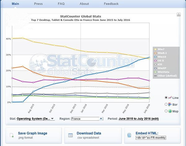 Win10一周年更新正式版即将在8月2日发布,微软也在继续推送Windows10系统更新。根据统计机构StatCounter结果,现在Win10已经超过Win7,成为法国市场第一大桌面级操作系统,份额接近30%。