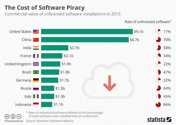 这是研究公司Statista发布的去年全球各地区盗版软件报告,中国每年使用的盗版软件价值达87亿美元,只比美国的91亿美元低一点,排名第二。这样看起来,美国才是盗版第一大国?其实不尽然。