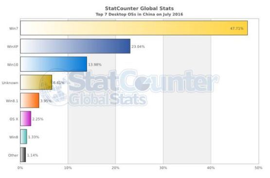 这是来自网络流量分析工具StatCounter统计的过去一年中国地区桌面操作系统份额变化图。