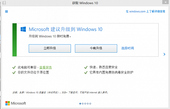 英语系统的用户也很悲催:要么立即升级,要么按照微软“推荐”给你的时间定时升级。想点红叉也没用,因为 Windows 10 已经跟之前的反病毒、安全更新一样,变成了推荐更新。