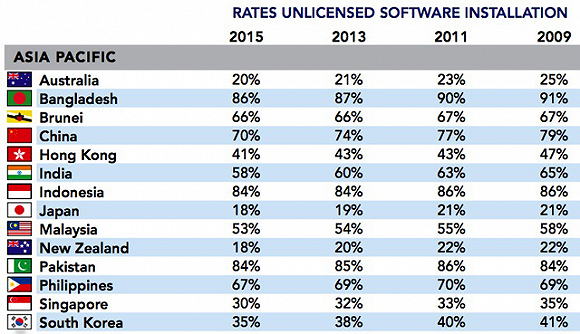 鲍尔默还是微软CEO的时候,吐槽过中国电脑安装的Windows里90%都是盗版,先不跟这个数据较真,但这里有一个图表还是能说明一些情况: