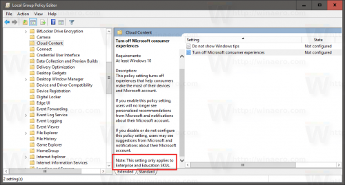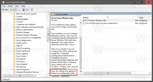 组策略“不显示Windows tips”中同样仅限于Windows 10企业版或者教育版,该策略用于取消tips和toast通知。无法启用该策略意味着那些已经对系统有丰富经验的人被当做新手对待,在日常操作中显示相关的指导。