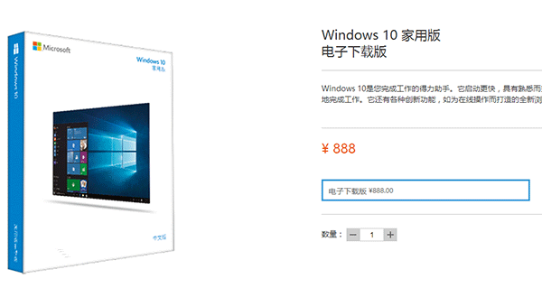 现在,微软中国官网已经上架了Windows10家庭版(点此访问微软商城),售价为888元,其他版本目前尚未在官网现身。