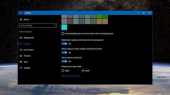 只需点一下开关,你就能把Windows 10给涂黑。深色主题此前是Windows 10的一个隐藏功能,但它现在已经正式与我们见面了。进入设置>个性化>颜色,你就可以找到这个选项。开启之后,系统的对话框和部分Universal App的背景都会变成黑色。