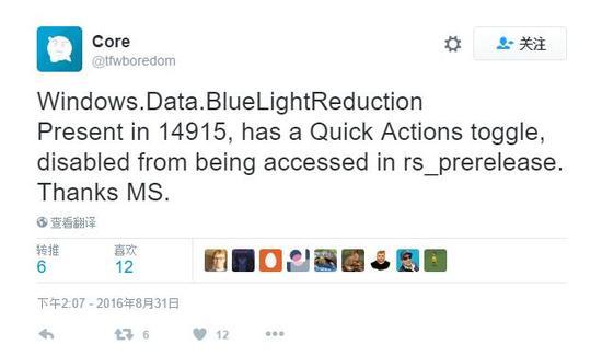 在即将到来的Windows 10重大更新到来之际,微软也在近日暗示了即将加入的新功能。据外媒报道,近日推特用户@Core在最新的推文中透露,它发现了刚刚面向Fast通道发布的Windows 10 Build 14915 版本中有关于“bluelightreduction”功能的相关文件,这或许也暗示了微软或将在Windows 10 PC端和移动端引入蓝光屏幕保护功能。
