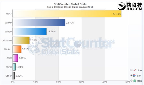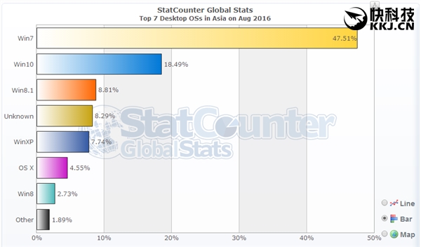 然而,亚洲区依旧不乐观,Win7攫取高达47.51%的市场,Win10只有18.49%。