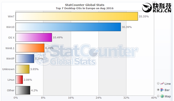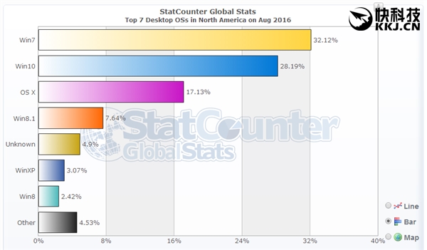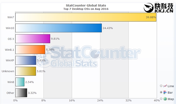 统计机构StatCounter给出了8月份最新的的操作系统份额情况,从流量数据观察,Windows 10的全球份额进一步逼近Win7。