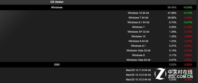 OSX和Linux方面,这两个系统仍然在游戏界属于小众,其中OSX下降0.02%达到3.52%的总份额,Linux则下降0.04%达到0.89%的总份额。