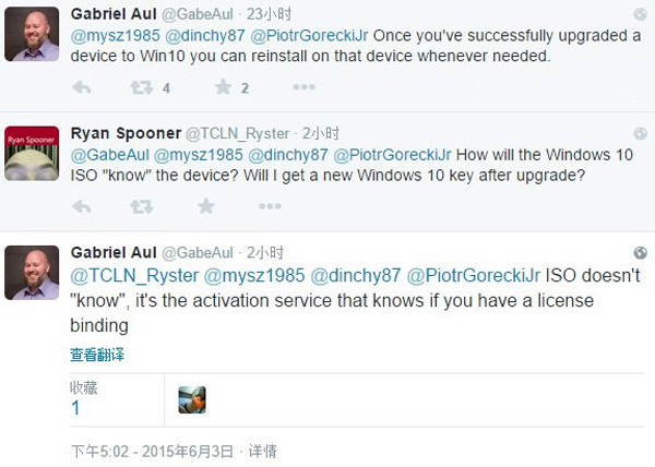 纠结症又再次发作了,装还是不装?其实早在去年微软负责Win10预览体验计划的Gabriel Aul就在Twitter回答过用户相关的问题,他表示一旦用户设备升级到Win10,任何时间都可以免费重装。同时表明Windows的ISO是不能识别设备的,WIN10激活是依靠“激活服务”来识别当前设备是否拥有许可证绑定的。