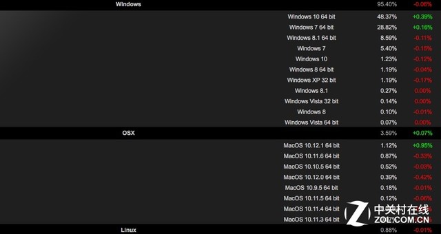 OSX和Linux方面,这两个系统仍然在游戏界属于小众,其中OSX整体上涨了0.07%达到3.59%,而Linux则继续下滑到了0.88%。