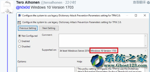 这是在Win10 14946预览版组策略编辑器的Legacy Dictionary Attack Parameters策略配置窗口中显示的支持版本中包括 Windows 10 Version 1703 ,这肯定就是Win10 RS2(红石2)正式版的版本号无疑。
