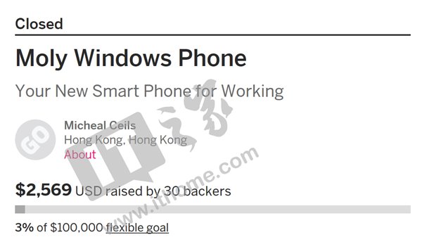 两周之前,Win10 Mobile手机Coship Moly x1开启众筹10万美元项目活动,不过最终失败。在两周时间内,Coship Moly x1仅吸引了11位直接购买者,另两周之后共获得30位支持者,筹资2569美元,只完成10万美元目标的3%。