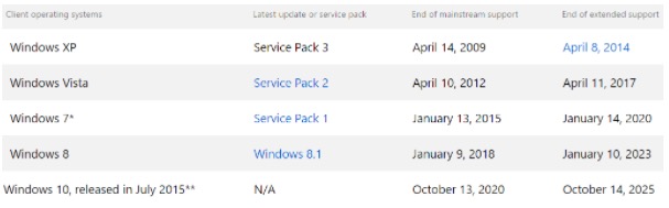 微软停止系统主流支持日期
