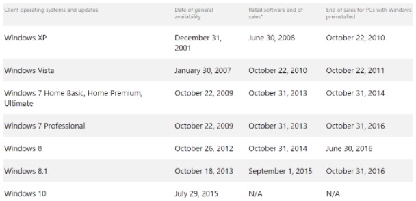 各版本Windows系统停售日期