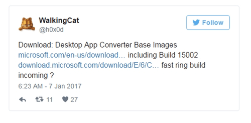 日前Twitter用户@WalkingCat在微软一款桌面应用程序转换器当中发现了Windows 10内测版build 15002,它似乎和桌面应用程序转换器打包在一起了,不过目前WalkingCat给出的地址已经无法下载,可能是微软发现了相关错误,下线了该文件包。