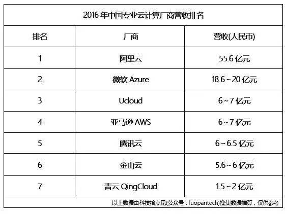 基于一些公开数据或者其他机构的调研数据整理的一份中国专业云计算厂商的营收排行榜单显示,阿里云以55.6亿元全年营收位居第一,是第二名微软 Azure 中国的3倍,包括腾讯云、金山云、亚马逊在内的第三阵营,收入均在6亿元左右。