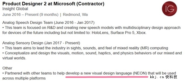 而且,win7最好看的毛玻璃也要在 win10 回归了!此前WMPU独家报道的Windows 10 UI改造计划“Project Neon”再次得到了侧面的确认,这次来自一位微软员工的LinkedIn档案,这位员工和其他团队一起参与NEON视效的开发,而且透露这是一个致力于跨平台的UI。