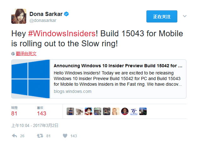 【PConline 资讯】昨天微软宣布将在“创作者更新”中彻底取消“更新自动重启”,而现在Windows 10 Mobile Build迎来更新,据外媒报道,负责Windows Insider项目的Dona Sarkar在推文中宣布该版本进入Slow通道,据了解,上周微软面向Fast通道(移动端)用户推动了Windows 10 Mobile Build 15043版本更新。。。