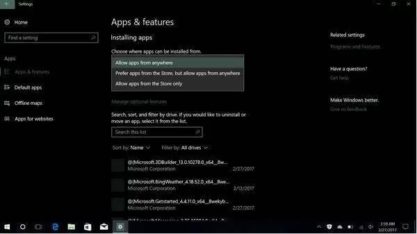 据外媒报道,微软在最新的Windows 10 Creators Update测试版中,于设定中加入了新的App权限管理功能,让用户可以选择透过任何管道安装App,或是限定通过Windows商店安装App。