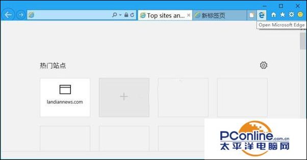 最右侧则生硬的增加了Microsoft Edge浏览器的标志, 点击该标志即可直接打开Microsoft Edge浏览器 。在IE设置中并没有找到关闭这个按钮的地方,看来会作为推广Edge浏览器的方式更新到Windows 10中。