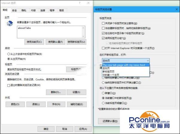如果用户想更改启动页面为其他的则可以在IE选项—常规—标签页中进行更改,如下图: