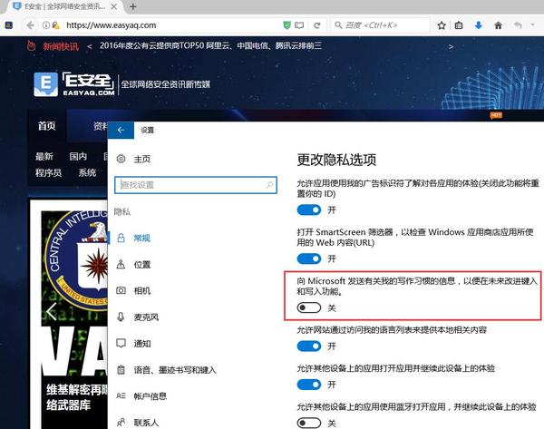 关掉“向微软发送有关我的写作习惯的信息,以便在未来改进键入和写入功能”选项。
