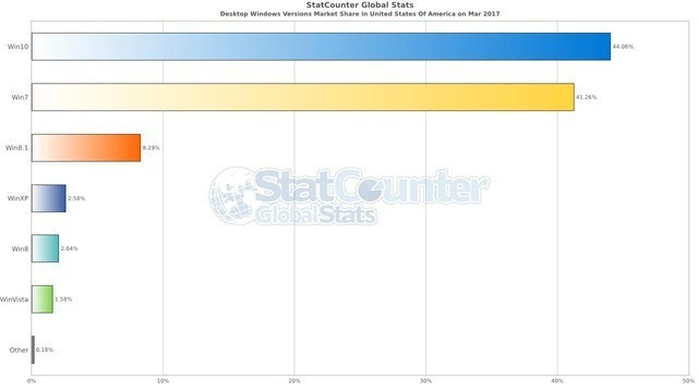 而在美国市场中,Windows 10占比高达44.06%,Windows 7占比为41.26%,Windows 8.1占比8.29%。