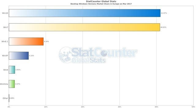 根据StatCounter发布的研究数据,欧洲市场中Windows 10占据了41.07%的桌面市场,Windows 7占比40.95%,这两大系统占比综合高达82%,Windows 8.1排名第三,占比9.34%。
