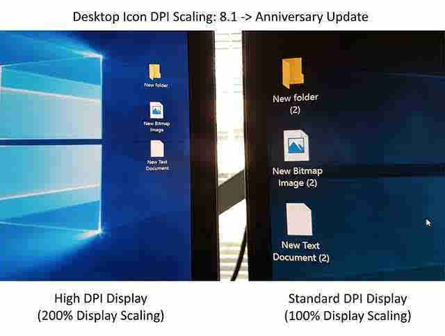 另外一点经常被抱怨的是桌面的尺寸,进一步说是组合显示器情况下的分辨率尺寸。Peter Felts针对组合显示器展示的是一个以200%渲染、一个以100%比率渲染的情况,大家可以看到在此前的版本中两块显示器的桌面图标大小相差很大,而现在的大小已经近乎一致。