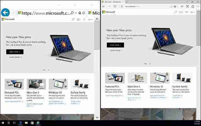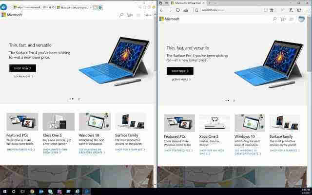 首先来对比看看最基本的Internet Explorer,也就是我们俗称的IE浏览器。当大家装好系统的时候一般小编相信很多人都遭遇过第一张图的左边,可以看到尺寸完全渲染错误。在最新的RedStone 2 Creator Update当中尺寸已经渲染正常。