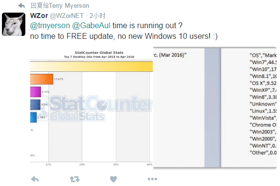 爱玩Twitter的俄罗斯知名“爆料大神”WZor也在第一时间转载了这篇博客,不过他对于微软强调的“Windows10限免升级将到期”表示不快。他在Twitter中呛声光头哥Gabriel Aul和Terry Myerson,称“(免费升级)时间快到了?没有免费升级,就不再有新的Win10用户!”很显然,“大神”的意思是:Win10不免费就没有未来。