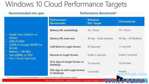 在上图中,每一项都在直接和Chrome Book在作比较,说明微软这次是注定要和谷歌抢夺这一块市场了。需要注意的是,以上配置虽然比Win10的最低配置要高一些,但是这个并不是Win10 Cloud运行需要的最低配置,而是推荐配置。作为专供教育市场的设备,要做到学生拿到任意一个设备都可以迅速登录并且瞬间获得自己的数据资料和已安装应用,需要高速网络连接,高速和大容量的储存设备。