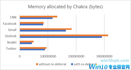 在 Internet Explorer 中创建 Defer 属性报告需要 10 天时间,这还不包括后续的关于时间处理程序的 Defer 属性分析,而 Edge 浏览器现在已经支持重推迟(re-deferring)功能,这就会减少浏览器界面网页的加载时间,并可以改善下一步综合性能。通过测试观察, Chakra 渲染引擎可以改善浏览器 6% 到 12% 的内存分配。
