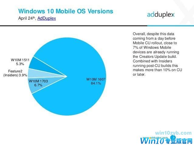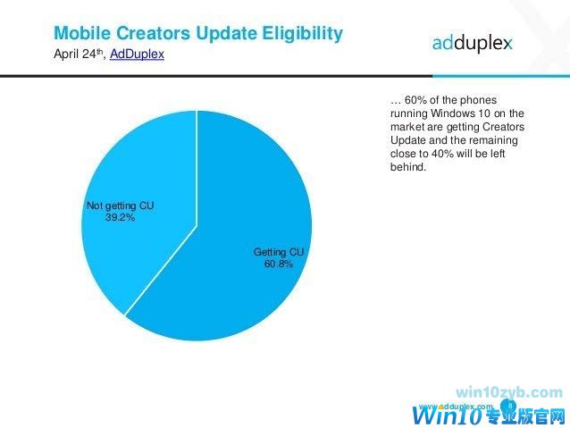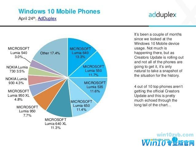 这仅有的,将可以获得创意者更新的13部手机,实际上占据了Windows 10 Mobile设备总数的60.8%——根据截至2月份的AdDuplex报告,只有17%的Windows手机正在运行Windows 10操作系统——而这意味着,在今天过后,将仅有10.3%的Windows手机会运行Windows 10创意者更新。