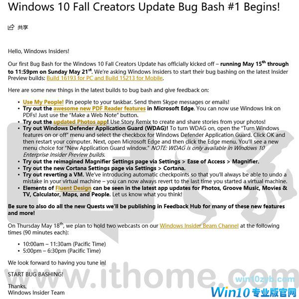 5月15日消息 今天,微软通过反馈中心向预览者发布公告,正式开启了Windows10秋季创意者更新的第一个“Bug大扫荡(Bug Bash)”活动,活动时间为5月15日星期五至5月21日星期日,总共一星期。