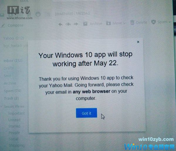 你的Windows10应用即将在5月22日以后停止工作。感谢你使用Windows10客户端来收发雅虎邮件,今后,请通过你电脑中的任意浏览器来收发你的邮件。