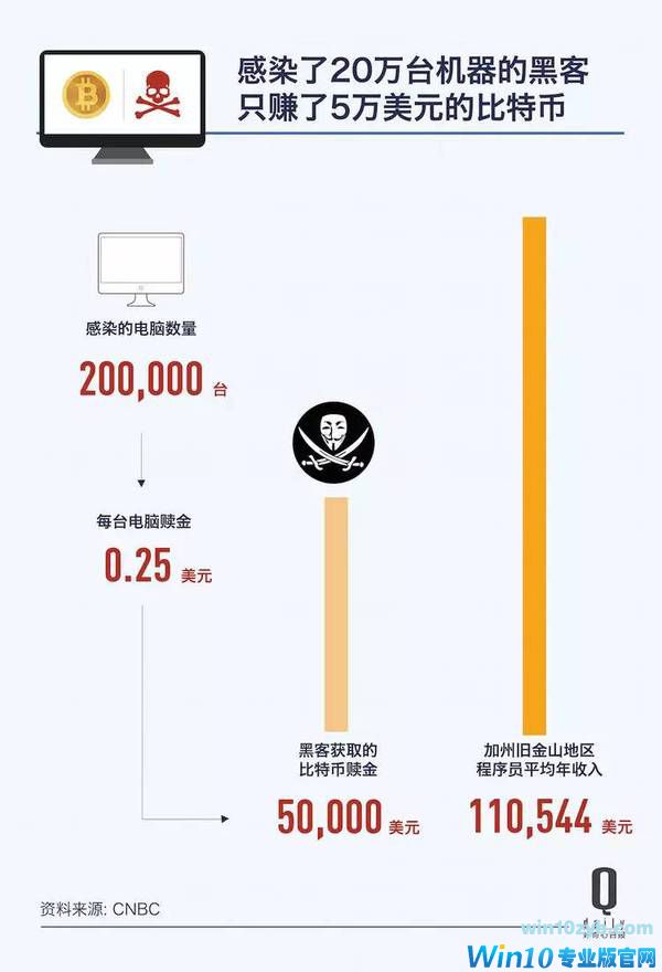 总计 20 万台受感染电脑、5 万美元“赎金”,相当于黑客每感染一台电脑拿到 0.25 美元。