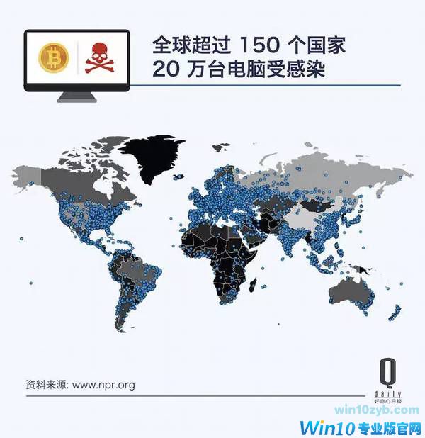 从上周五晚间出现,到本周一为止,至少有 150 个国家的超过 20 万台 Windows 计算机被锁住。