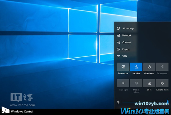 在Win10目前的通知中心和任务栏设计中,快速操作按钮是集成在通知中心里面的,任务栏上也有着网络连接等等的设置图标。很多用户抱怨这样的UI逻辑很令人费解。于是在下图的新设计中,所有操作被整合在了任务栏中的一个齿轮图标的二级菜单中,让任务栏不再像以前一样拥挤。